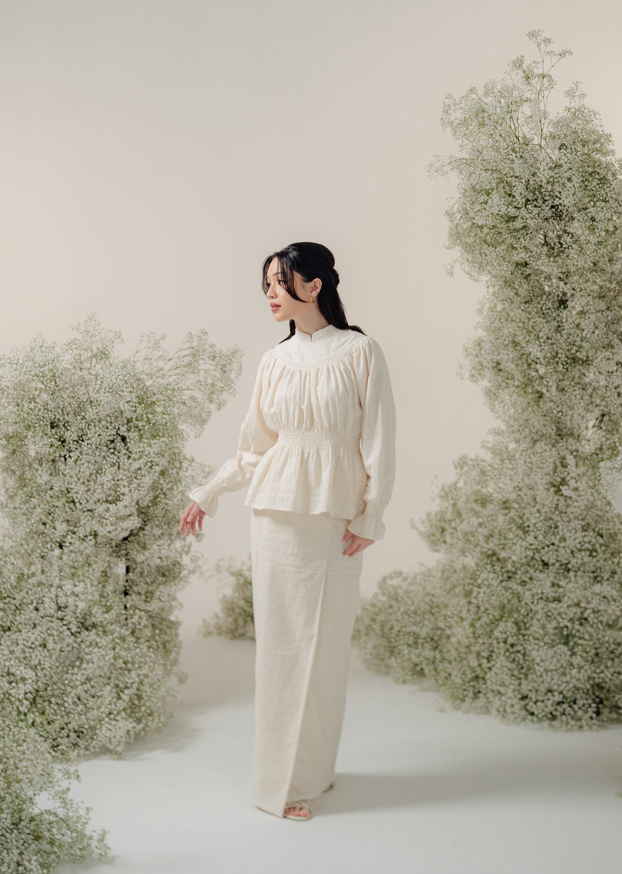 A nod to vintage romance with a modern twist, our Josie Kurung is defined by its softly gathered bodice and delicate, scalloped trim that traces the neckline. A shirred waist cinches just so, creating a feminine peplum silhouette that floats gently over the matching skirt. Billowy sleeves end in subtly flared cuffs, lending an air of poetic ease to this timeless set. Available in both a warm Burnt Brown and an elegant Cream, the Josie Kurung effortlessly transitions from daytime celebrations to evening soirées—simply style with minimal gold accents and let the textured fabric’s quiet sophistication take center stage