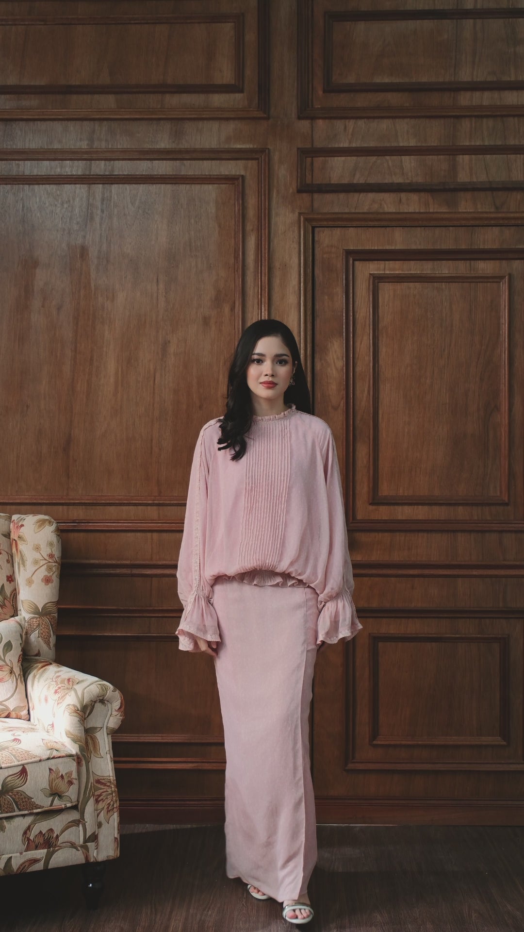 The kurung skirt balances the volume above, keeping the overall look composed and wearable. Celestine is for those who favour softness over statement, and detail that reveals itself slowly, the longer you wear it.